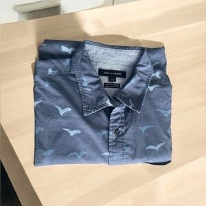This Men's Seagull Print Regular Fit Short Sleeve Woven shirt by Tommy Hilfiger is perfect for a a casual day or beach vacation style. Made from cotton fabric blend, this button-up shirt features a button-down collar and a chest pocket for a classic look. The blue color and nautical theme make it a stylish choice for the summer and spring seasons. With a regular fit and size L, this shirt is easy to care for and machine washable, making it a convenient and comfortable addition to any man's wardrobe.