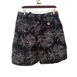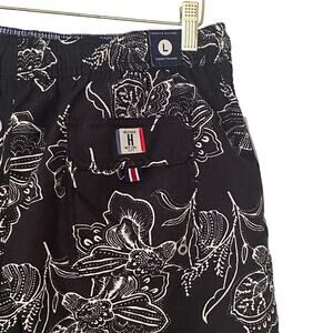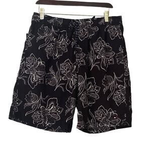 Tommy Hilfiger Mens Size Large Black Gray Flower Print Pull On Swim Shorts Trunks