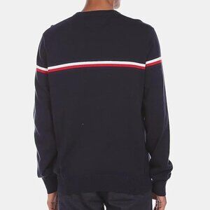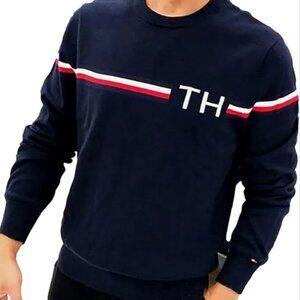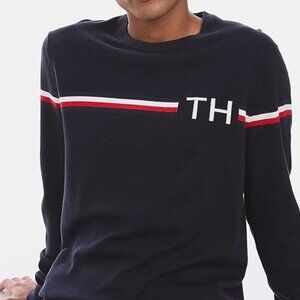 Tommy Hilfiger Men's Stripe Logo Cotton Knit Sweater in size L. The color is white, with woven blue and red stripe logo. Crew neck, ribbed neck, hem and cuffs. Excellent condition, only worn twice by the hubby who prefers Tall sizing.