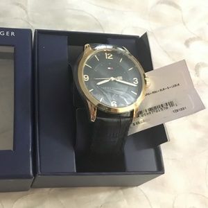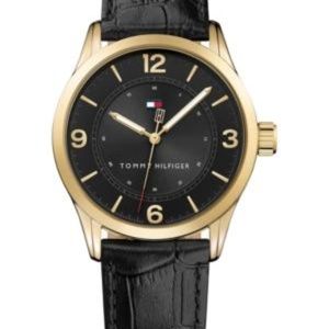 Black dial with gold-tone numerals and indices, three hands and Tommy Hilfiger logo
