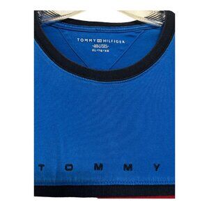Add a pop of color to your casual wardrobe with this Tommy Hilfiger men's XL t-shirt in vibrant blue. Featuring a bold horizontal logo stripe in red, white, and black across the chest and classic crew neck styling with contrast trim, this shirt blends iconic branding with all-day comfort.