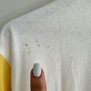 Brand new, never worn, this has been in storage and does have a few spots on front and back right shoulder as seen in pics. Will most likely come out in wash. Tags still attached. Overall length is 32”.