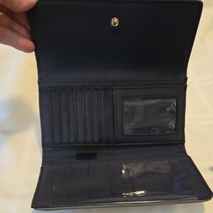 Elegant wallet with signature monogram pattern. Features sleek design and secure closure.