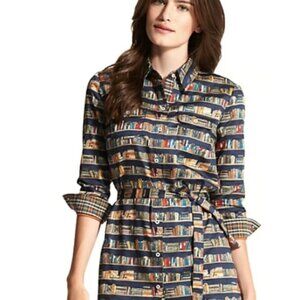 Tommy Hilfiger Vibrant shirt dress with a adorable bookshelf print design. Features a mix of blue, orange, and red colors. Perfect for a unique style statement, or any book lover.