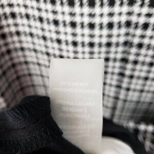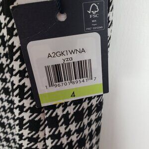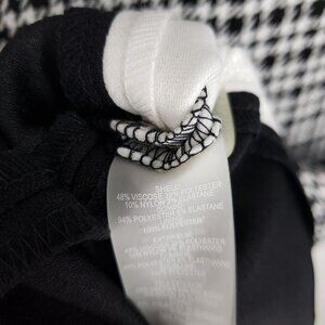 Sleeveless sheath dress with round neckline. Concealed back zipper with logo zipper pull. Black and white houndstooth plaid with solid contrast trim. Stretchy and supportive thick material. Knee length.