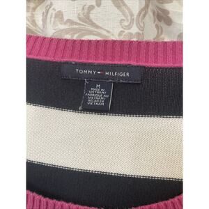 This Tommy Hilfiger sweater in size M features a nautical navy striped design with pink trim and button accents, giving it a stylish and playful look. The sweater has a crew neck and long sleeves, offering a comfortable fit for everyday wear. Crafted from cotton knit fabric, this pullover sweater is machine washable for easy care. Perfect for adding a touch of nautical flair to your wardrobe, this Tommy Hilfiger sweater is a versatile and chic choice for women who appreciate quality and style.
