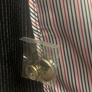 Worn once for an interview, this item is in perfect condition. Extra buttons inside. One button closure, dual front pockets. Pinstriped lined, tailored back. Four buttons going down each sleeve. Very small polka dot pattern that goes with everything.