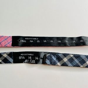 Bundle of two (2) bow ties. Bow tie one (1): Tommy Hilfiger Navy Blue and White Check Pattern Silk Adjustable Self-Tie Bow Tie. Has a hook that can be adjusted to fit neck sizes 13 3/4 inches to 18 inches. Made in China of 100% silk. Bow tie two (2): No Brand Listed Pink-Red and Blue Check Pattern Cotton Adjustable Self-Tie Bow Tie. Has a hook that can be adjusted to fit neck sizes 14 1/2 inches to 20 inches. Made in China of 100% cotton. Please note these are self-tie bow ties and not the pre-tied bow tie style. Excellent condition - purchased many years ago and barely worn.
