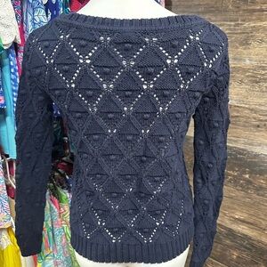 This blue crew neck sweater by Tommy Hilfiger showcases a sophisticated diamond knit pattern, offering a blend of classic style and modern flair. The medium-weight fabric ensures comfort and warmth, making it ideal for cooler days. Its cropped length adds a contemporary touch, perfect for pairing with high-waisted bottoms.