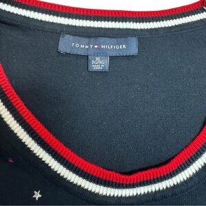 This Tommy Hilfiger sweater showcases a classic crewneck design with a navy blue base and vibrant red and white striped ribbed trim. Embellished front with star sequins adding a touch of preppy, patriotic charm, while the relaxed fit ensures comfort and style.