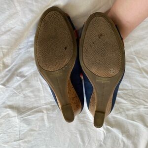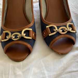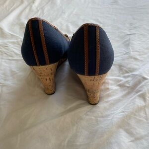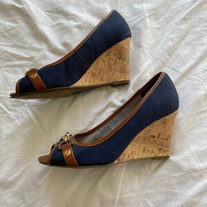 These gorgeous platform shoes by Tommy Hilfiger feature wonderful gold details and navy luxury. They are in excellent condition with some minor scuffs as pictured. Marked as a size 7.5.
