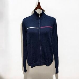 🌻Tommy Hilfiger Navy Blue With White Red Flag Stripe Full Zip Knit Sweater XL