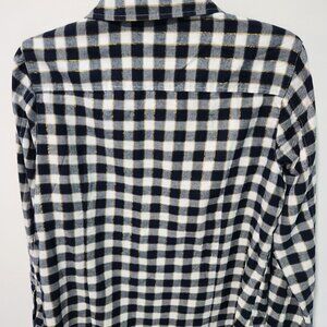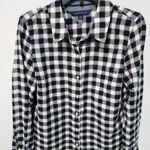 Tommy Hilfiger Navy Blue/White/Gold Plaid long sleeve button up shirt. One pocket on the front with Tommy Hilfiger logo. Two buttons on each cuff. Long sleeves can be rolled up and there is a button in the middle of the sleeve with a tab to hold the sleeve when you roll it up. This item is in excellent condition and super soft!