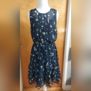 Chic navy midi dress with floral print. Sleeveless and stylish. Perfect for any occasion.