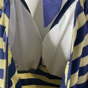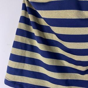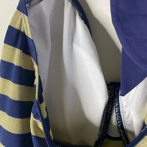 Navy blue and gold striped Tankini from Tommy Hilfiger. Halter style. Ties at neck. Removable padding. Size 14. Gently preowned condition with no tears or stains.