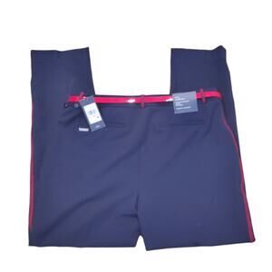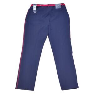 Elevate your wardrobe with the Tommy Hilfiger Navy Radcliffe Pants, designed to combine style and comfort effortlessly. These navy blue pants feature eye-catching red stitching along the side of each leg and come with a bright red skinny belt, adding a pop of color to your outfit. Imagine the confidence you'll feel with their slim leg, ankle-length design, and two front pockets, perfect for keeping essentials handy. New with tags, these pants sit comfortably below the natural waist, offering a flattering fit for any occasion. Enjoy the satisfaction of a fantastic deal on a sustainable fashion piece that doesn't compromise on style or quality.