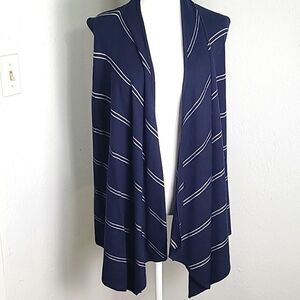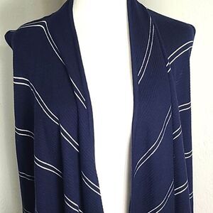 * Sleeveless waterfall cardigan in navy blue with white stripes running through it. Made of 55% cotton, 25% polyester & 20% viscose in size medium. This is a beautiful, fashionable cardigan.