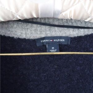 Chic navy long cardigan with gray accents. Features button closure and front pockets. Ideal for layering and great for this fall season!