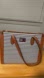 Chic handbag with navy and white stripes. Brown leather handles and trim. Iconic Tommy Hilfiger logo on front.