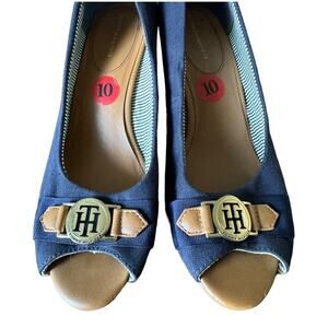 Women's Tommy Hilfiger Wedge Heels Size 10M Navy Blue with Brown Accents