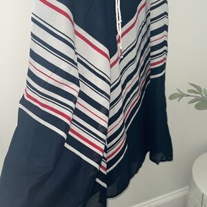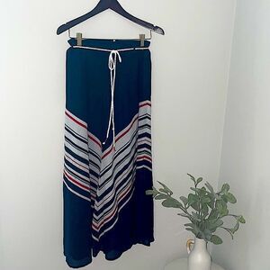 This is a beautiful navy maxi skirt lined with zipper closure. It is accent with red and white v stripes. Also has a rope tie belt.