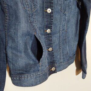 Light distressing around the collar. Button close. Chest and side pockets. Feminine cut. Excellent condition.
