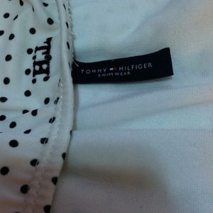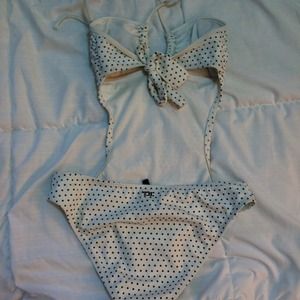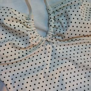 White, navy polka dot once piece, cut @ the side swim wear. :/ can't pull this off after I had my baby.