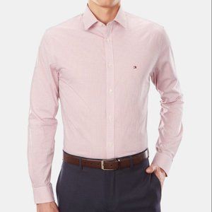 Tommy Hilfiger thin skinny plaid pattern long sleeve button up dress shirt. Size 15-1/2 32-33. White shirt with blue/orange plaid pattern. One-button barrel cuffs and button down collar. 100% cotton. Two spare buttons on inner tag. Slight discoloration on right arm cuff (see photo). In great condition with no other flaws.