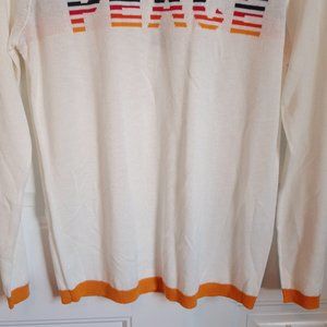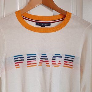 Tommy Hilfiger 'PEACE' Cream & Mustard Yellow Sweater. Graphic retro 90's style sweater with striped rainbow "PEACE" across the chest and ringer style mustard yellow trim.