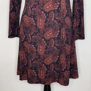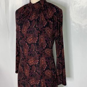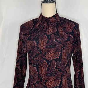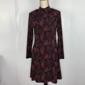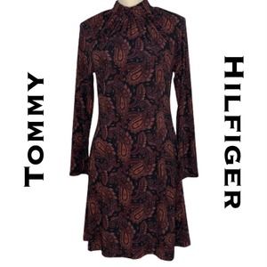 Elegant paisley dress by Tommy Hilfiger. Features a high neckline and long sleeves. Perfect for any occasion.