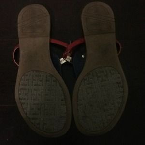 Slightly worn but in very good condition. Red, white, and blue thong sandals.