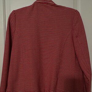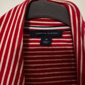 This is a Tommy Hilfiger red and white striped blazer, often referred to as a "sailor blazer" or "military-style jacket" due to its double-breasted design and prominent buttons. It is an open-front jacket with decorative buttons, sometimes described as having a band collar. This style is a recurring design from the brand, appearing in various collections.