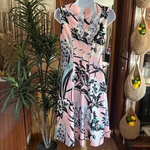 Keywords: tommy hilfiger floral dress, pink a-line dress, sleeveless fit and flare, size 0 floral dress, wedding guest dress, spring summer dress, romantic floral dress, sleeveless lined dress, botanical print dress, XS pink dress, brunch outfit dress, garden party dress, feminine floral dress, tailored fit flare dress, tommy hilfiger XS dress, summer wedding outfit, designer floral dress, soft pink dress XS, back zip cocktail dress, pastel floral print dress, event dress XS, preppy tennis dress