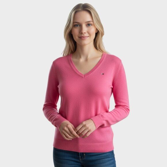 A soft and lightweight Tommy Hilfiger Prima Cotton sweater in a vibrant pink hue, finished with a classic V-neck and subtle logo detail. Flattering, comfortable, and perfect for effortless everyday style.