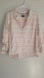 Chic striped blouse with a soft pink and white palette. Features a button-up front and roll-up sleeves. Perfect for casual outings.