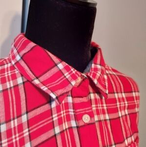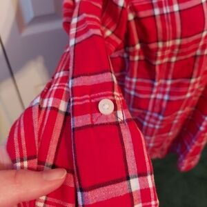 •Tommy Hilfiger Plaid Roll Tab Long Sleeve Shirt Size Large. Brand new never worn but may be a bit wrinkly. Red, white and black plaid flannel Tommy Hilfiger shirt. 3/4 button front. Has a front pocket. Contrasting chambray lined neck and cuffs. Sleeves have a roll tab. Comes with an extra button. Bundle for a better price!