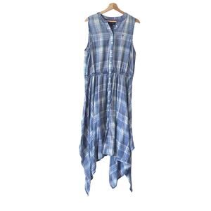 Tommy Hilfiger Womens Plaid Sleeveless Shirt Dress Blue Checkered Midi Handkerchief Hem