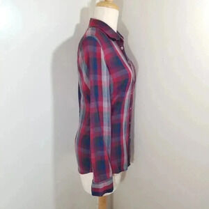 EUC: Super cute plaid button down shirt by Tommy Hilfiger. Multi-colored. Gold Logo Embossed Buttons. Front Pocket. 100% Cotton. Size: XS. Measurements (flat): Bust 16.5", Sleeves 25", Length 27". Date Listed 11.28.20.