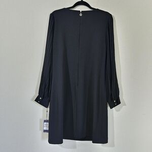 New with tags! size 12 Crewneck sheath silhouette Back zipper closure Long pleated chiffon sleeves buttoned cuffs Unlined Polyester/spandex; sleeves: polyester Dry clean