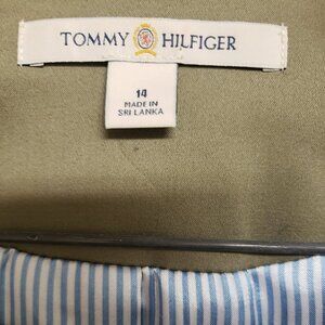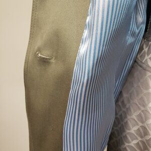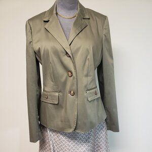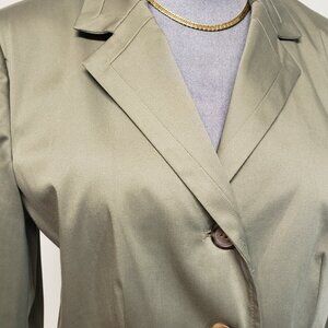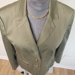The sharpest looking blazer ever, easy care, nice color and sheen and cool blue-pinstriped lining. Lightly padded shoulders this jacket has two front pockets, wood styled buttons is cotton/spandex and has a back vent. Size 14- 23 length, 25 sleeve, and 19 pit to pit.