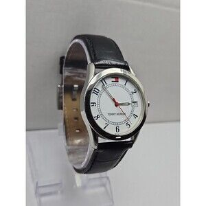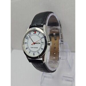 Tommy Hilfiger Quartz Watch New Battery White Dial Date Black Leather Strap 99ft