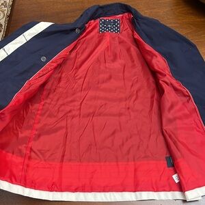 Tommy Hilfiger Rain Coat Navy Blue stylish coat size small . This is a perfect little coat to wear when its raining or even a everyday coat. Navy blue, red, and white