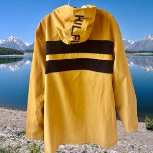 Tommy Hilfiger yellow & black full zip jacket with hood. Snap flap overlay on zipper. Two front zippered pockets. Adjustable hood. Mesh lining. Hook & loop closure on cuffs. Wind and water resistant. Tommy Hilfiger flag rubber logo on chest. Spell out Hilfiger on the hood.