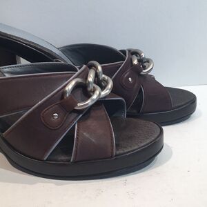 This listing is for a pair of Tommy Hilfiger “Ramona” Brown leather heels with a silver decorative chain.