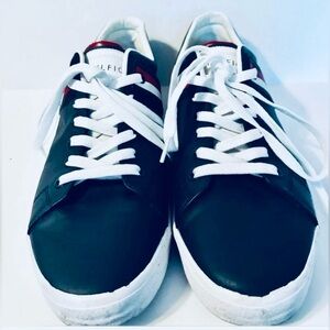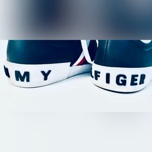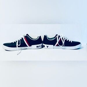 Stylish Tommy Hilfiger Ramus sneakers featuring navy blue, white, and red accents. Comfortable and trendy design. Global stripe details and heel wrap branding. Padded collar and cushioned memory foam footbed. Preowned excellent condition, barely worn. Minor scuffing on outsole as shown in pictures.