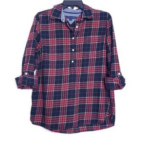 Tommy Hilfiger Red & Black Plaid Flannel Half Button Pullover Casual Blouse Top. Convertible sleeves. Good pre-owned condition.