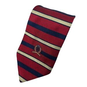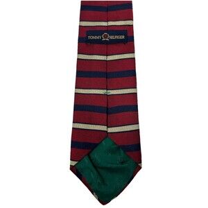 Add a touch of elegance to your wardrobe with thisTommy Hilfiger Red Blue Tan Striped Silk Tie. Crafted from premium 100% silk, this classic necktie features a timeless striped pattern in a vibrant red, blue, and tan palette, complemented by the iconic Tommy Hilfiger logo accent.Designed to fit perfectly with a length of 57.25 inches and a width of 3.75 inches, this tie is a standout accessory that effortlessly elevates any outfit. Made in the United States, it's an excellent choice for the discerning gentleman looking to make a refined statement.