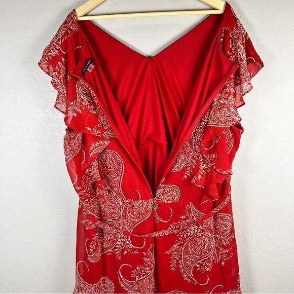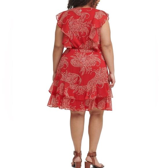Tommy Hilfiger dress, paisley print dress, red ruffle dress, knee length fit and flare, plus size dress 22W, tie waist dress, V neck ruffle dress, classic red dress, feminine paisley dress, party dress, summer event dress, NWT Tommy Hilfiger, curvy fit and flare, flattering waist tie dress
