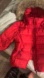 Stylish red puffer jacket. Features a cozy fur-lined hood. Perfect for cold weather.