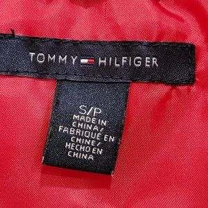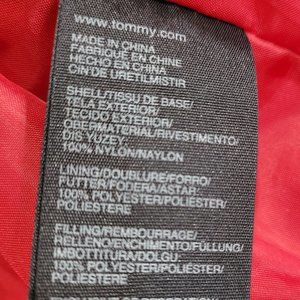 Tommy Hilfiger Red Puffer Vest. Nylon outer shell, polyester fill. Full zipper front, 2 snaps stand up collar, two front zippered pockets and a small inner pocket for earbuds. Approximate measurements: 19.5" pit to pit, 17" waist, 20" hips, 26.5" long. Size Small. Excellent condition. Worn once, washed and ready to go. I bought it just before I gained 10lbs and it doesn't fit.